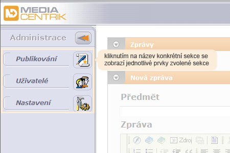Navigační sekce slouží pro přechod mezi dílčími prvky administračního rozhraní (viz obr. 2). Pro snadnější orientaci jsou jednotlivé prvky rozděleny takto: